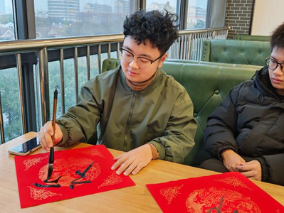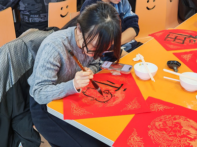 煮饺子期间,趣味写对联、福字活动同步上线。早已备好的笔墨纸砚整齐摆放,同学们踊跃参与,有的挥毫对联,有的临摹福字,笔墨间满是对新年的期许。大家互相展示作品,分享书写心得,还将写好的福字赠予身边同学,食堂内既有饺香萦绕,又有墨韵飘香,节日氛围愈发浓厚。
