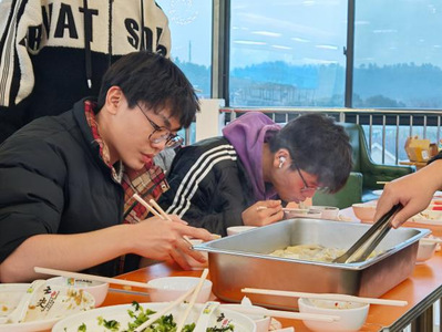 下午四点整,包饺子活动正式开始,食堂工作人员迅速为各小组分发食堂备好的食材与工具,同学们围坐桌边,分工协作、互帮互助,有的均匀放馅,有的认真捏合,一张张饺子皮在手中快速变成形态规整的饺子,餐盘里很快堆满了鼓鼓囊囊的成果,现场一派热火朝天的温馨景象。